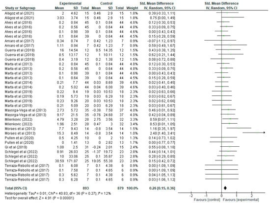 Regarding upper limb strength improvement variable (Figure 4), each article shows the mean, standard deviations (SD) and the total number of participants in both the experimental group (who undertook strength training) and the control group (who did not). These values allow the calculation of the standardised mean difference (mean difference), together with its 95% confidence interval (CI), which allows assessment of the magnitude of the effect in each study. For example, in the study by Alagöz [20], the experimental group has a mean of 2 with a SD of 4.62 and 15 participants, while the control group has a mean of 0.46 with a SD of 2.9, resulting in a standardised mean difference of 0.39 with a CI of [−0.33, 1.11], suggesting a positive but not significant effect, as the CI includes the value 0. A more notable study by Milenkovic [36] shows a standardised mean difference of 0.59 with a CI of [0.07, 1.11], indicating a significant improvement in upper body strength for the experimental group. In the forest plot, each green line represents the CI of a study, with the green squares indicating the magnitude of the individual effect, and the size of the square reflecting the weight of that study in the overall meta-analysis. The black rhombus at the end of the graph represents the overall standardised mean difference, which is 0.26 with a CI of [0.15, 0.36], indicating that strength training has a positive and statistically significant effect on the improvement of upper body strength in schoolchildren. Regarding heterogeneity, the results show a Tau2 of 0.01, a Chi2 of 40.83 with 36 degrees of freedom (p = 0.27), and an I2 of 12%, indicating low heterogeneity among the studies, i.e., the results are quite consistent among the included studies. Finally, the overall effect test yields a Z value of 4.91 with a p < 0.00001, confirming that the overall effect of strength training on upper body strength improvement in schoolchildren is highly significant.