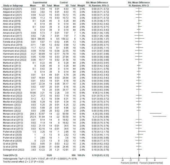 As for the lower limb variable (Figure 5), the mean, standard deviations (SD), and the total number of participants in both the experimental group (which underwent strength training) and the control group (which did not) are presented in detail. These values allow us to calculate the standardised mean difference (mean difference), together with its 95% confidence interval (CI), thus assessing the magnitude of the effect in each study. For example, in the study by Alagöz [20], the experimental group shows a mean of 0.03 with a SD of 5.94 and 15 participants, while the control group has a mean of 0.01 with a SD of 6.03 and 15 participants, resulting in an SMD of 0.00 with a CI of [−0.71, 0.72], suggesting no significant effect, since the CI includes the value 0. Another study, the one by Alves et al. [21], presents a mean of 0 with a SD of 0.14 and 39 participants in the experimental group, and a mean of 0 with a SD of 0.14 in the control group, resulting in an SMD of 0.00 with a CI of [−0.42, 0.42], again indicating a non-significant effect. In contrast, the study by Mesfar [35] shows an SMD of 4.54 with a CI of [3.14, 5.94], indicating a significant improvement in lower body strength in the experimental group. In the forest plot, each green line represents the CI of a study, the green squares indicate the magnitude of the individual effect, and the size of the square reflects the weight that the study has in the overall meta-analysis. The black diamond at the bottom of the graph represents the overall SMD, which is 0.18 with a CI of [0.03, 0.33], indicating that strength training has a positive and statistically significant effect on lower body strength improvement. Regarding heterogeneity, the results show a Tau2 of 0.15, a Chi2 of 119.47 with 47 degrees of freedom (p < 0.00001), and an I2 of 61%, indicating moderate heterogeneity between studies. Finally, the overall effect test yields a Z value of 2.37 with a p = 0.02, confirming that the overall effect of strength training on lower body strength improvement is statistically significant.