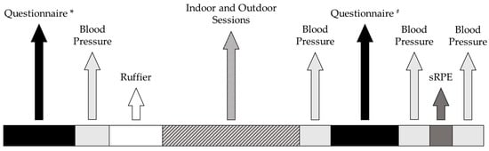 During the familiarization session and before each session, the participant was asked to complete questionnaires on adherence to the Mediterranean diet, sleep quality, chorotype, and physical activity level. Moreover, blood pressure and recovery index were assessed before each session. The specific parameters evaluated during data collection are described below. After each session, blood pressure, session RPE (sRPE), and enjoyment of the activity were recorded.