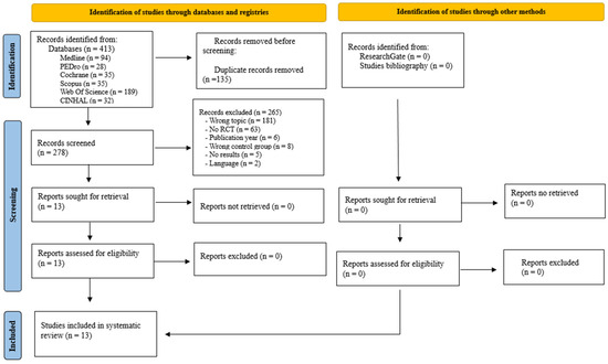 The literature search resulted in a total of 413 records from Medline (n = 94), PEDro (n = 28), Cochrane (n = 35), Scopus (n = 35), Web of Science (n = 189), and CINAHL (n = 32). No eligible studies were identified in ResearchGate or the reference list of relevant studies. After duplicate removal (n = 135), the titles and abstracts of the remaining 278 publications were analyzed. A total of 265 publications were eliminated for not being related to the topic of interest (n = 181), not being randomized clinical trials (n = 63), having been published prior to 2014 (n = 6), having a CG who did not perform LT (n = 8), being protocols without results (n = 5), and being in a language other than English, Spanish, Italian, and Portuguese (n = 2). The remaining 13 trials were examined in full text and met the selection criteria for inclusion in the systematic review [31,32,33,34,35,36,37,38,39,40,41,42,43] (Figure 1).