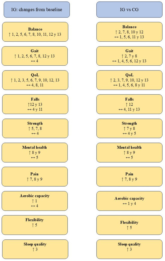 Summary of the results obtained. Abbreviations. ↑ Statistically significant improvements (p < 0.05); ↔ No statistically significant difference (p > 0.05); CG: control group; IG: intervention group; QoL: Quality of life. Authors. 1. Clerici et al. [31], 2. Kurt et al. [32], 3. Loureiro et al. [40], 4. Nogueira et al. [41], 5. Nowak [42], 6. Palamara et al. [43], 7. Pérez de la Cruz [35], 8. Pérez de la Cruz [34], 9. Pérez de la Cruz [33], 10. Shahmohammadi et al. [36], 11. Terrens et al. [37], 12. Volpe et al. [39], 13. Volpe et al. [38].