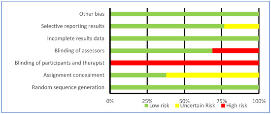 The assessment of bias is represented in Table 4 and Figure 3 according to Cochrane recommendations [30]. All studies showed low risk in random allocation of participants, incomplete outcomes data, and other biases [31,32,33,34,35,36,37,38,39,40,41,42,43]. In contrast, all studies were at high risk of blinding participants and therapists [31,32,33,34,35,36,37,38,39,40,41,42,43]. Eight of the studies did not specify in the methodology how allocation concealment was performed [32,33,34,35,36,39,41,42]. The three studies by Pérez de la Cruz [33,34,35] had an unclear risk of selective reporting of results.