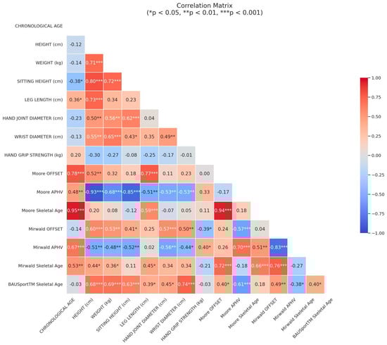 Descriptive anthropometric parameters were calculated in the first step to provide an overview of the data, including means, standard deviations, and ranges (minimum and maximum values) for all variables, as well as the percentages of late, on-time, and early maturers (%). Secondly, using a paired samples t-test, the difference between the chronological and skeletal age of the participants was calculated. The third step contained correlation analyses with the aim of assessing the relationships between the skeletal age estimates of the three methods (Moore, Mirwald, and BAUSportTM), as well as their relationships with other measured parameters. In the fourth step, the authors investigated the results of repeated-measures analysis of variance (ANOVA) with a post hoc Tukey test to compare the skeletal age estimates from each pair of methods (Moore vs. Mirwald, Moore vs. BAUSportTM, Mirwald vs. BAUSportTM) to test for significant differences. Regression analysis was conducted to explore the predictive power of BAUSportTM method and to assess the influence of other variables like height, weight, sitting height, leg length, hand grip strength, wrist, and hand joint diameter. Normality of data was assessed using the Shapiro–Wilk test prior to parametric statistical procedures. All analyses were conducted using Statistica 14.1, TIBCO Software Inc., Santa Clara, CA, USA.