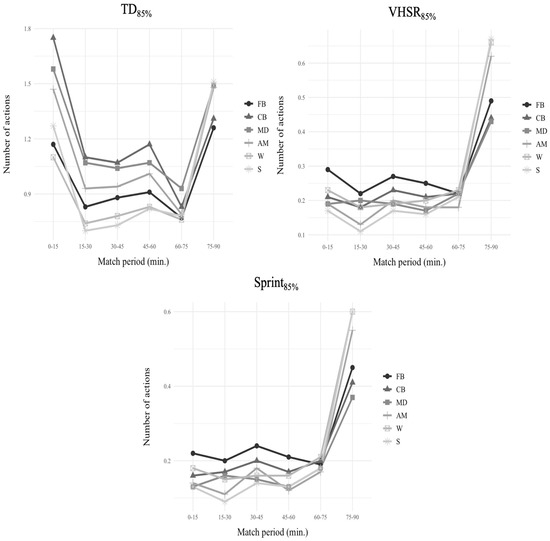 Finally, concerning Sprint85%, in the 0–15 period, FB showed significant differences with respect to MD and S (p < 0.05). During the 15–30 period, FB presented significant differences compared to AM (p < 0.01) and S (p < 0.001). CB and MD showed significant differences with respect to S (p < 0.05). In the 30–45 period, FB presented significant differences compared to MD (p < 0.01), W (p < 0.05), and S (p < 0.01). CB showed significant differences with respect to S (p < 0.05). During the 45–60 period, FB presented significant differences compared to MD (p < 0.05), AM (p < 0.01), and S (p < 0.01). In the 75–90 period, FB showed significant differences with respect to AM (p < 0.05), W (p < 0.01), and S (p < 0.01). Similarly, CB and MD presented significant differences compared to AM, W, and S (p < 0.001).