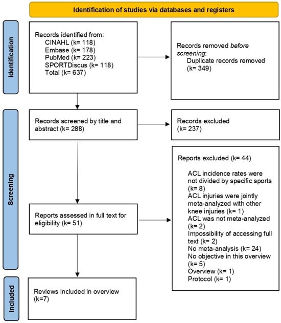 A total of 637 references were retrieved from the electronic databases. No extra studies were retrieved by other methods (e.g., manual searches). After removing duplicates, 288 references were read by title and abstract, and 51 full texts were analyzed. Seven systematic reviews with meta-analysis were [1,9,10,11,12,13,14]. Two corresponding authors were contacted via email to request the full text of their reviews, but no responses were received. Therefore, these reviews were excluded for the reason “impossibility of accessing full text”. Figure 1 shows the PRISMA 2020 flow diagram.