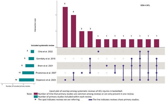 Upset plot of overlap among systematic reviews of ACL injuries in basketball [9,10,11,13,14].