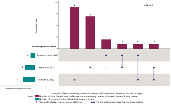 Upset plot of overlap among systematic reviews of ACL injuries in American football or rugby [9,10,13].