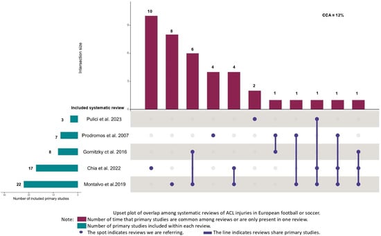 Upset plot of overlap among systematic reviews of ACL injuries in European football or soccer [1,10,11,12,13].