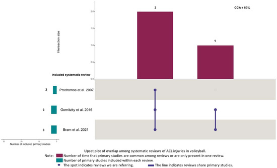 Upset plot of overlap among systematic reviews of ACL injuries in volleyball [9,11,13].