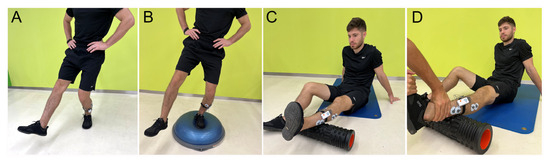 (A) Single leg squat, (B) BOSU ball, (C) dynamic ankle eversions, (D) Maximal Voluntary Isometric Contraction (MVIC).