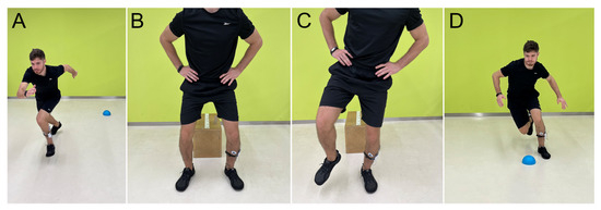 (A) Sprint, (B) bilateral drop jump, (C) unilateral drop jump, (D) change of direction.