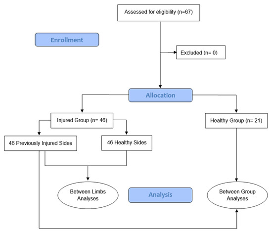 Flow chart. Participants were classified into the “Control Group” and “Ankle Sprain Group” according to whether they had previous ankle injuries. In the Ankle Sprain Group, both the injured limb (Previously Injured Side) and the non-injured limb (Control Group) were analyzed for comparison.