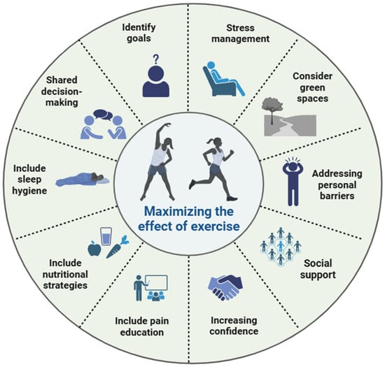 (IV) Clinicians should be aware of the various barriers that may limit physical activity, including intrapersonal factors (e.g., beliefs and fear of movement), interpersonal factors (e.g., lack of social support), environmental concerns (e.g., environmental safety), and systemic issues (e.g., lack of knowledge and programs) [135,136,137]. To overcome these barriers, it is essential to educate patients, implement progressive programs, encourage group exercise, and develop government policies that ensure equitable and timely access to physical activity programs [138]. Strategies to maximize the effect of exercise and physical activity in people with chronic pain are summarized in Figure 3.