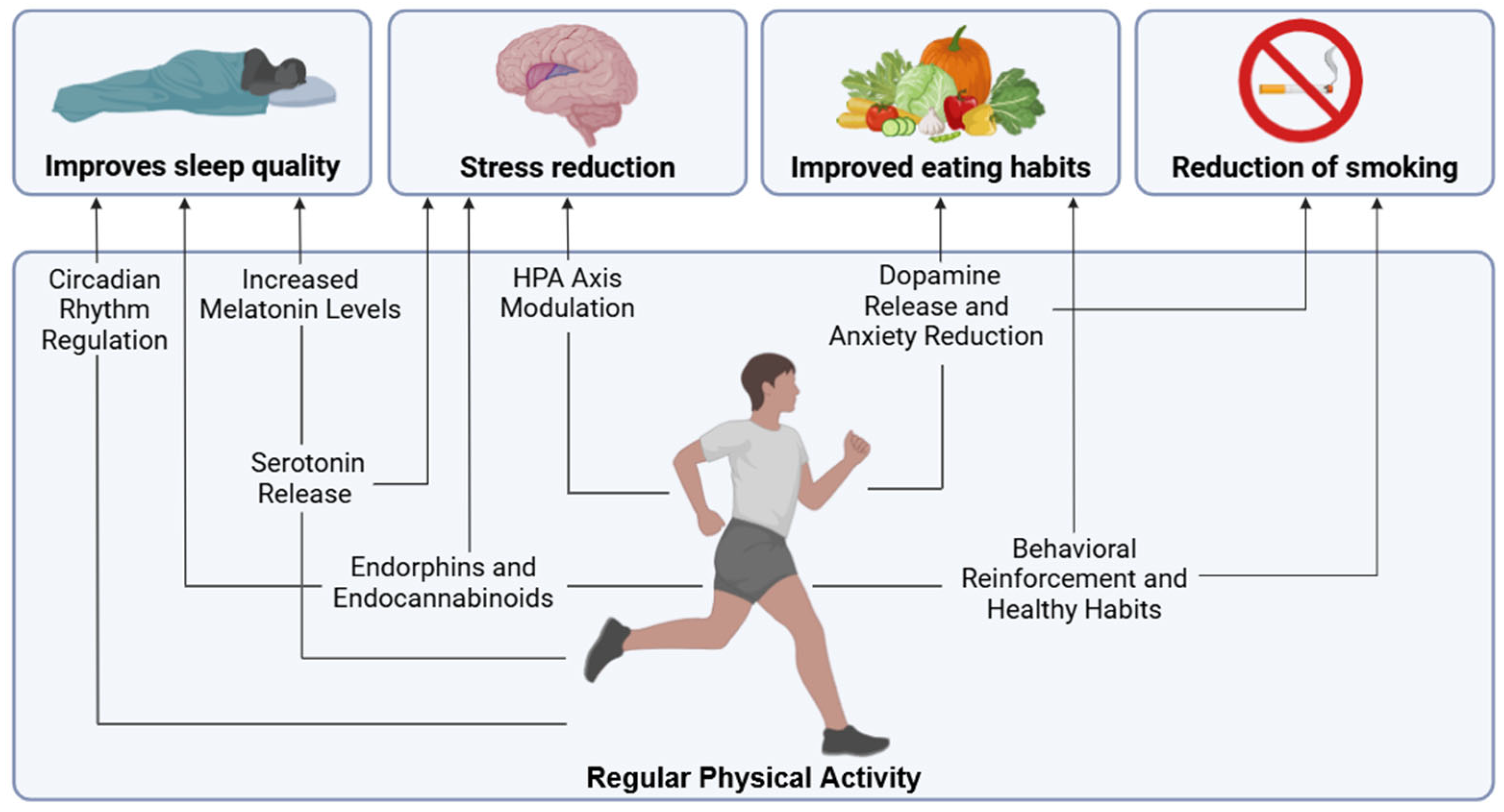 All information gathered in this review was summarized and qualitatively classified according to an outline previously defined by the team: (1) physical activity and modulation of chronic pain, (2) physical activity and improvement of sleep quality, (3) physical activity to reduce stress, (4) impact on diet and metabolic regulation, (5) physical activity and smoking reduction. This framework was established a priori by the team based on known associations between physical activity and lifestyle factors that influence chronic pain. The information provided by the studies was summarized and synthesized narratively and is presented in figures as a summary (created with BioRender.com). Furthermore, a standardized table was created to extract information from the representative studies, including the following data: study design, population, lifestyle domain, and main findings.