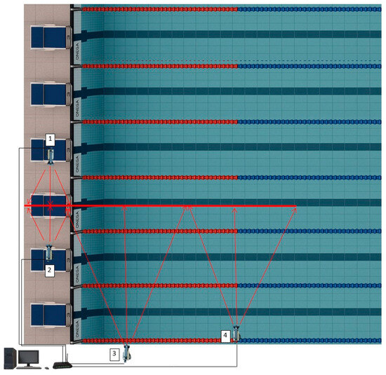 Set-up of the cameras. The red line represents the swimmer’s movement relative to the cameras. The red lines from the camera are the fields of view of the cameras.