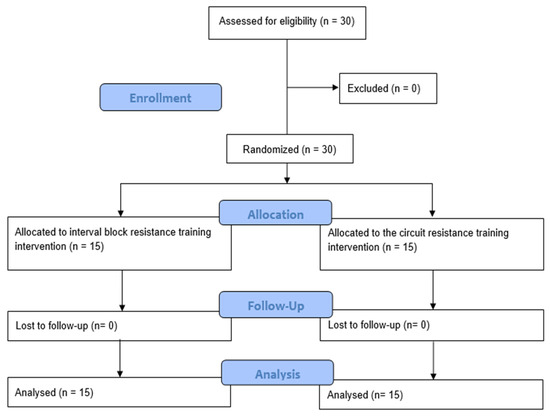 The intervention included 30 physically active young adults with normal weight and low cardiometabolic risk. Participants were assigned to an experimental group (n = 15), with a mean age of 25.2 ± 3.19 years, and a control group (n = 15), with a mean age of 23.27 ± 3.69 years.