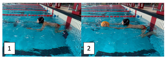 Starting position involving pushing from the wall, without the ball (1) and with the ball (2). Note. This photo was previously used during an international conference presentation of the authors [24], and the player’s parents signed their consent to the publication of this photo.