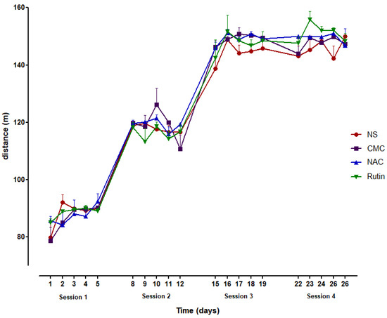 The distance covered during the 4 running sessions (5 days/session) in groups of normal saline (NS), carboxymethylcellulose (CMC), N-acetylcysteine (NAC) and Rutin.