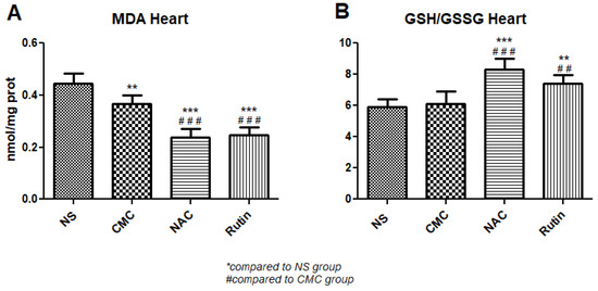 In heart, administration of NAC decreased MDA (p < 0.001) and increased the GSH/GSSG ratio (p < 0.001), compared to the NS group. Similarly, Rutin lowered MDA levels (p < 0.001) and increased the GSH/GSSH ratio (p < 0.01), compared to the CMC group (Figure 2).