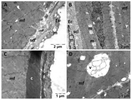 Samples from lung, muscle, aorta and heart were initially fixed in a 2.7% glutaraldehyde solution in 0.1 M phosphate buffer. Then, the samples underwent 4 washes in the same buffer. For postfixation, a 1.5% osmium tetroxide (OsO4) dissolved in 0.15 M phosphate buffer was used. The samples were then dehydrated using a series of acetone solutions with increasing concentrations (ranging from 30% to 100%), followed by infiltration and embedding in EMbed 812. Ultrathin sections measuring 70–80 nm in thickness were obtained using a Diatome A382 diamond knife (Diatome, Hatfield, PA, USA) on a Bromma 8800 ULTRATOMEIII (LKB, Stockholm, Sweden). These sections were subsequently collected onto 300 mesh copper grids, contrasted with uranyl acetate and lead citrate and examined at 80 kV using a JEOL JEM-100CX II transmission electron microscope (JEOL, Tokyo, Japan). Images were captured using a MegaView G3 camera fitted with Radius 2.1 software, both supplied by Emsis (Münster, Germany).