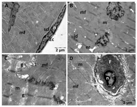 Transmission electron microscopy of the heart in the carboxymethylcellulose (CMC) group following intense physical exertion. The endocardium had a normal endothelium with reduced subendothelial thickness (A), while the myocardium displayed disorganized myofibrils (B,C). Fibroblasts were observed between heart muscle cells (D). (Ec: endothelial cell; er: endoplasmic reticulum; F: fibroblast; g: glycogen; id: intercalated disks; m: mitochondria; mf: muscle fibers; n: nucleus; scl: subendothelial connective layer).