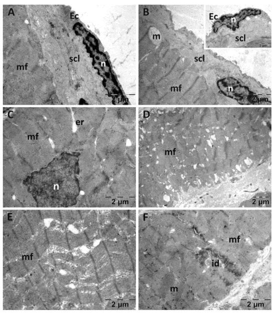 Transmission electron microscopy of the heart in the N-acetylcysteine (NAC) group following intense physical exertion. The endocardium has a normal endothelium and subendothelium (A), while the myocardium shows swollen mitochondria (B), enlarged smooth endoplasmic reticulum (C), minor disorganization of myofibrils (D,E) and large spaces between the dense plaques of the intercalated disks (F) (Ec: endothelial cell; er: endoplasmic reticulum; id: intercalated disks; m: mitochondria; mf: muscle fibers; n: nucleus; scl: subendothelial connective layer).