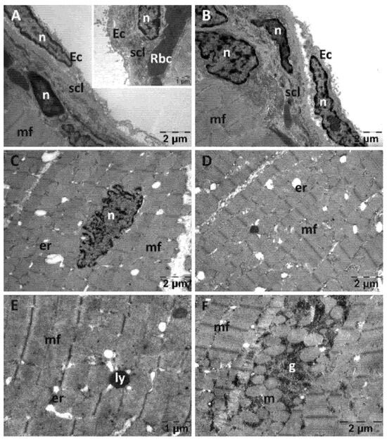 Transmission electron microscopy of the heart in the Rutin group following intense physical exertion. The endocardium shows a slight increase in subendothelial distance and increased subendothelial thickness (A,B), while the myocardium exhibits minor changes (C–E). In some areas, glycogen granules accumulated between myofibrils (F). (Ec: endothelial cell; er: endoplasmic reticulum; g: glycogen; ly: lysosome; m: mitochondria; mf: muscle fibers; n: nucleus; scl: subendothelial connective layer; Rbc: red blood cell).