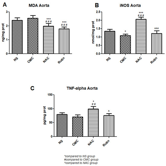 Oxidative stress and inflammation markers in the aorta: malondialdehyde (MDA) (A), inducible nitric oxide synthase (iNOS) (B) and tumor necrosis factor alpha (TNFα) (C) in the groups normal saline (NS), carboxymethylcellulose vehicle (CMC), N-acetylcysteine (NAC) and Rutin. Rutin and NAC decreased MDA levels in the aorta following intense physical exertion. Rutin had no protective effects against the aortic inflammation caused by sprinting, while NAC increased both iNOS and TNFα levels (* p < 0.05, *** p < 0.001 compared to NS; ## p < 0.01, ### p < 0.001 compared to CMC; ^ p < 0.05, ^^^ p < 0.001 compared to NAC).