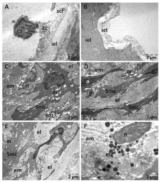 Transmission electron microscopy of the aorta in the normal saline (NS) group following intense physical exertion. The endothelial cells were prominent in the lumen (A) and in several places detached from the subendothelial layer (B). The subendothelial layer was thick and disorganized and smooth muscle cells appeared with abnormal structure (C–E). Mast cells with granules were also present (F). (Ec: endothelial cell; el: elastic lamina; em: extracellular matrix; iel: internal elastic lamina; m: mitochondria; mg: mast cell granules; n: nucleus; scl: subendothelial connective layer; Smc: smooth muscle cell).