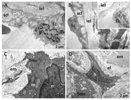 In the vehicle group (Figure 9), the endothelial cells were distanced from the subendothelial layer and emitted prolongations towards the inner elastic lamina (Figure 9A,B). In the cytoplasm they presented Weibel-Palade bodies, showing a tendency of the endothelium to recover. There were areas with a disorganized subendothelial layer and endothelial cells that were separated from the underlying structures (insert in Figure 9B). The smooth muscle cells displayed fewer affected mitochondria, and the perinuclear space appeared normal in most cells (Figure 9C,D). The intercellular matrix contained large amounts of collagen fibers and presented areas of a lower density (Figure 9D).