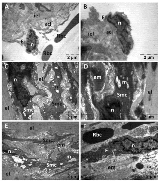 Transmission electron microscopy of the aorta in the N-acetylcysteine (NAC) group following intense physical exertion. The endothelium wasdetached; the subendothelium was disorganized (A,B), the smooth muscle cell had altered mitochondria (C) and a disorganized aspect (D,E). The extracellular matrix had an abnormal aspect (F). (Ec: endothelial cell; el: elastic lamina; em: extracellular matrix; F: fibroblast; iel: internal elastic lamina; m: mitochondria; n: nucleus; Rbc: red blood cell; scl: subendothelial connective layer; Smc: smooth muscle cell.).