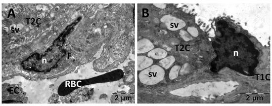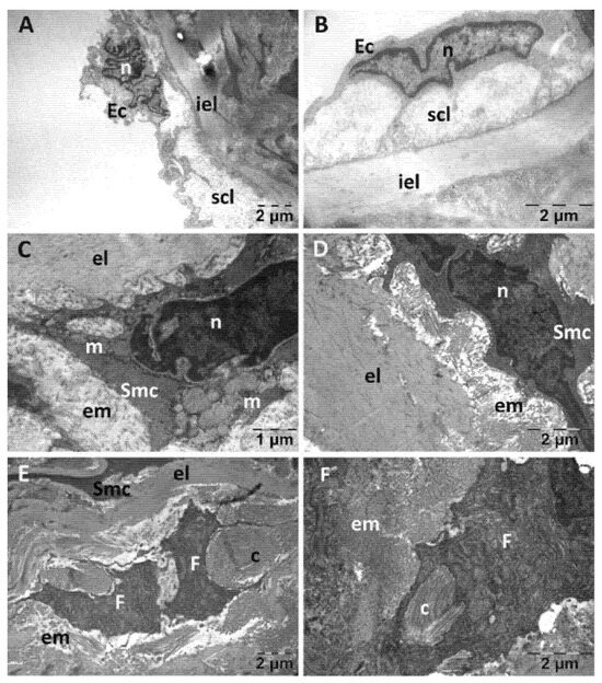 The NAC group (Figure 10) showed detachment of the endothelial cells from the subjacent structures, a reduced thickness of their prolongations and a disorganization of the subendothelial layer and a variable thickness of the inner elastic lamina (Figure 10A,B). The smooth muscle cells displayed swollen mitochondria with disrupted cristae and an electron-lucent matrix (Figure 10C–E). A large amount of collagen was observed between the smooth muscle cells (Figure 10D,E) as well as occasional fibroblasts (Figure 10F), but the inflammatory cells were absent.