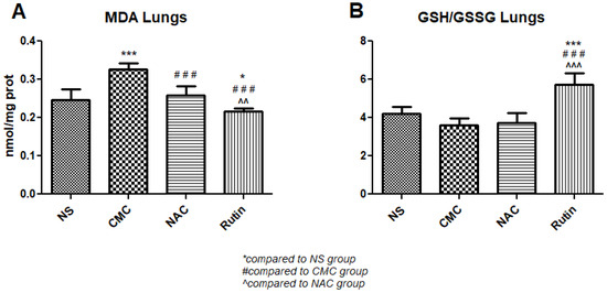 In the lung, NAC had no effect on oxidative stress. When compared to the vehicle, Rutin showed lower levels of MDA (p < 0.01) and an increase in the GSH/GSSH ratio (p < 0.001). Compared to NAC, Rutin decreased MDA (p < 0.001) and increased the GSH/GSSH ratio (p < 0.001) (Figure 12).