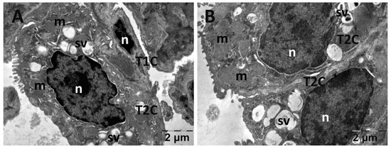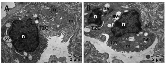 Transmission electron microscopy of the lung in the carboxymethylcellulose (CMC) group following intense physical exertion. The lungs had an almost normal aspect, but the surfactant vesicles were not so abundant (A,B) (m: mitochondria; n: nucleus; sv: surfactant vesicles; T1C: alveolar cell type 1; T2C: alveolar cell type 2).
