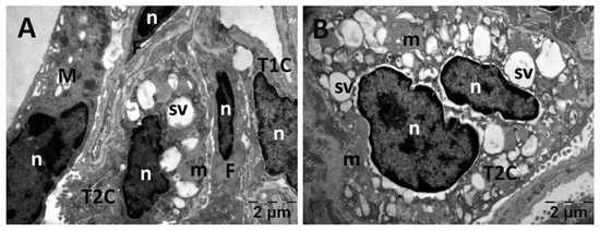 Transmission electron microscopy of the lung in the N-acetylcysteine (NAC) group following intense physical exertion. The lungs had an increased number of vacuoles (A,B) (F: fibroblast; M: macrophage; m: mitochondria; n: nucleus; sv: surfactant vesicles; T1C: alveolar cell type 1; T2C: alveolar cell type 2).