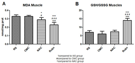 Oxidative stress markers in the gastrocnemius muscle: malondialdehyde (MDA) (A) and the reduced-to-oxidized glutathione ratio (GSH/GSSG) (B) in the groups normal saline (NS), carboxymethylcellulose vehicle (CMC), N-acetylcysteine (NAC) and Rutin. Rutin decreased MDA levels and increased the GSH/GSSG ratio, while NAC only decreased MDA (* p < 0.05, *** p < 0.001 compared to NS; # p < 0.05, ### p < 0.001 compared to CMC; ^^^ p < 0.001 compared to NAC).