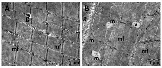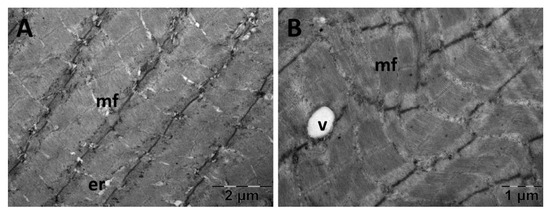Transmission electron microscopy of the gastrocnemius muscle in the Rutin group following intense physical exertion. The skeletal muscle had a normal aspect (A) with rare vacuoles (B) displaying the protective effects of Rutin administration. (er: endoplasmic reticulum; mf: muscle fibers; v: vacuolization).
