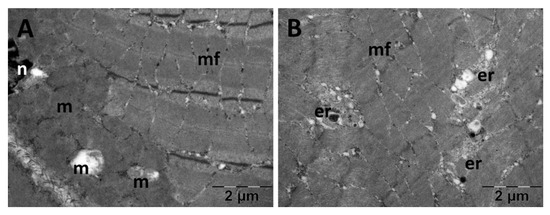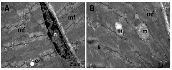 Transmission electron microscopy of the gastrocnemius muscle in the carboxymethylcellulose (CMC) group following intense physical exertion. The skeletal muscle appeared close to normal (A) but with several swollen mitochondria (B) (er: endoplasmic reticulum; g: glycogen granules; m: mitochondria; mf: muscle fibers; n: nucleus).