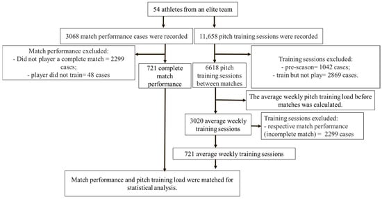 Data on the conditioning sessions between games were collected. Pre-season training was excluded from the analysis, and a total of 11,658 training sessions were observed. Only the training loads corresponding to complete matches were included. The average number of training sessions per week before the match was calculated (reported here as a weekly training block). Players who did not complete a conditioning session but had played just one match were excluded from the analysis (see detailed description in Figure 1). Strength training and recovery sessions were not included in the analysis.