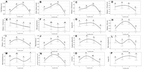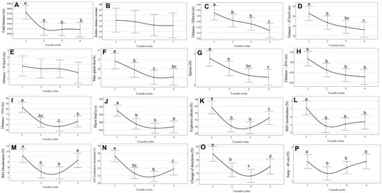 Change in weekly training load over season, divided into three-month quartiles (data are mean estimated values and 95% CI). (A) Total distance (m); (B) relative distance; (C) distance > 20 km/h; (D) distance > 25 km/h; (E) distance > 30 km/h; (F) maximum speed; (G) number of sprints; (H) distance > 20 W·kg−1; (I) distance > 55 W·kg−1; (J) player load; (K) explosive effort; (L) IMA acceleration; (M) IMA deceleration; (N) GPS acceleration + deceleration; (O) change of direction; (P) jumps. Different letters denote statistical difference (p < 0.05) between quartiles.