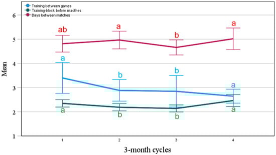 Changes in training and match frequencies over the season, divided into three-month quartiles (data are mean predicted values and 95% CI). We used Kruskal–Wallis followed by Bonferroni post hoc to verify the difference between quartiles. Different letters denote p< 0.05 across the quartiles.
