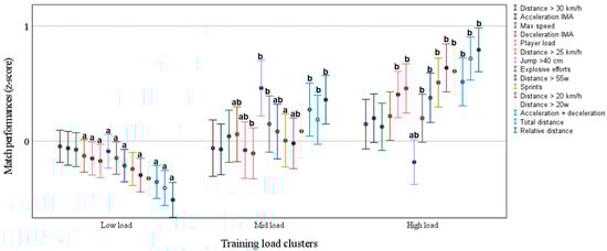 Match physical performance variables as a function of training load (data are mean estimated values and 95% CI). Different letters indicate statistical differences at p ≤ 0.5 when comparing the training clusters.