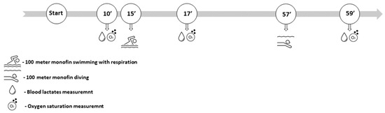 The procedure was performed in the 25 m swimming pool in the morning hours. Also, the procedure was performed after the competition season had ended to provide the most stable results and the highest performance. Upon arrival, participants rested for 10 min for a better assessment of b[LA]. In addition, baseline SpO2 was determined during that period. Afterward, participants executed a 100 m monofin swim with normal respiration. They were equipped with a monofin and diving snorkel to allow divers to breathe. After they finished the 100 m monofin respiration test, they took a 40 min rest to allow themselves a full recovery. The second test was conducted in the same manner apart from respiration. A 100 m monofin apnea was performed with the head of the participant submerged underwater, to prevent respiration. After both tests, both b[LA] and SpO2 were assessed. Both with respiration swimming and apnea swimming were performed with the same velocity (see Figure 1). The velocity of diving was assessed beforehand on the day prior to the test execution (since diving velocity is usually slower than swimming).