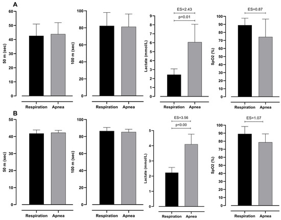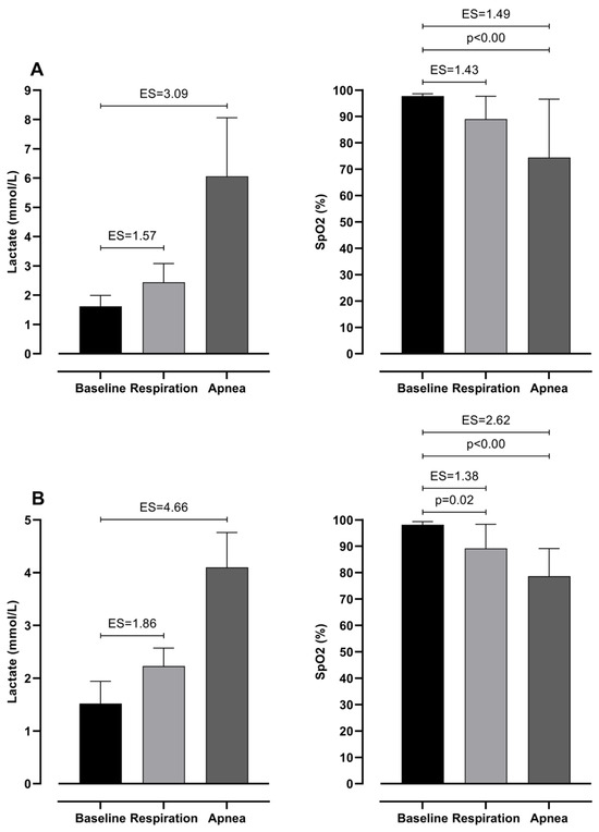 Differences between baseline, respiration, and apnea in Lactates and SpO2 with effect sizes (ES), for intermediate (A) and elite (B) groups.