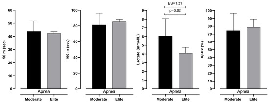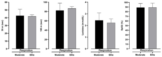 Table 3 presents two-factor ANOVA, which revealed possible differences between groups (elite and moderate) of BHD and type (respiration and apnea) of test. However, it can be seen that there is no significant interaction between them. This shows that both groups have differences in the same variables. Furthermore, lactate levels differ significantly between 100 m dives with respiration and during apnea. In particular, divers perceive significantly smaller levels of lactates during dives with respiration than during apnea. Additionally, SpO2 levels do not differ significantly; however, ES shows an intermediate effect between respiration and apnea dive. On the other hand, 50 m and 100 m times do not differ significantly (see Figure 3).