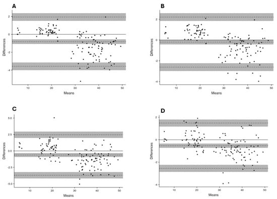 A study by Fernández et al. [9] showed, through the ICC, Pearson correlation, and CV values, the validity and reproducibility of the MJ application, which in turn is identical to our study. It has an ICC = 0.997 and a CV of less than 5%, while our study has an ICC = 0.995 and a CV of less than 5%. Pearson’s values, in the present study and in the study by Fernández et al. [9], show an almost perfect correlation between the app and the platform (p < 0.001). Finally, regarding the reliability of the application, almost perfect agreement was found between the difference in values between observers, with ICC values showing a difference of ±0.002 (Table 3).
