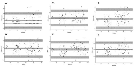 Bland–Altman plots between observers. (A) MJ1-MJ2; (B) MJ1-VTV1; (C) MJ1-VTV2; (D) MJ2-VTV2; (E) MJ2-VTV2; (F) VTV1-VTV2.