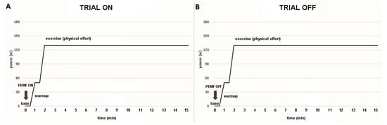 Temporal sequence of the trial. (A) ON trial: PEMF was activated at the beginning of the baseline (base) for 17 min (1 min baseline, 1 min warm-up, and 15 min of exercise). (B) OFF trial: PEMF was inactivated (sham stimulation).