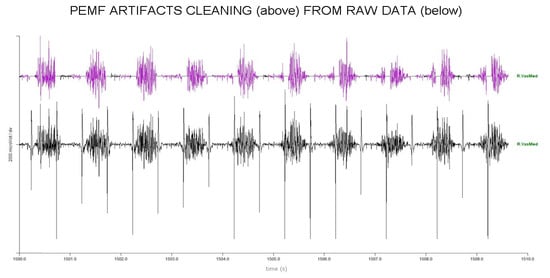 Artifacts removing process in 10 s of EMG raw trace of RVM. Upper part, purple: clean raw PEMF trace. Bottom part: original trace with PEMF artifacts before removal.
