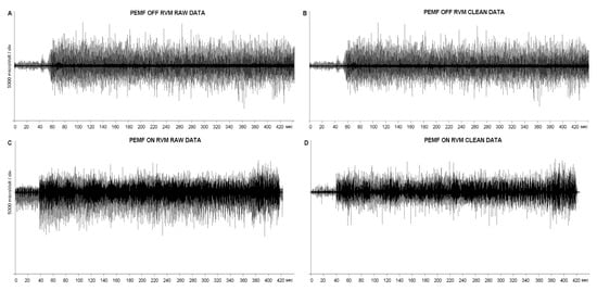 Complete EMG traces of RVM, in PEMF ON and OFF conditions, before and after the artifacts removing process.